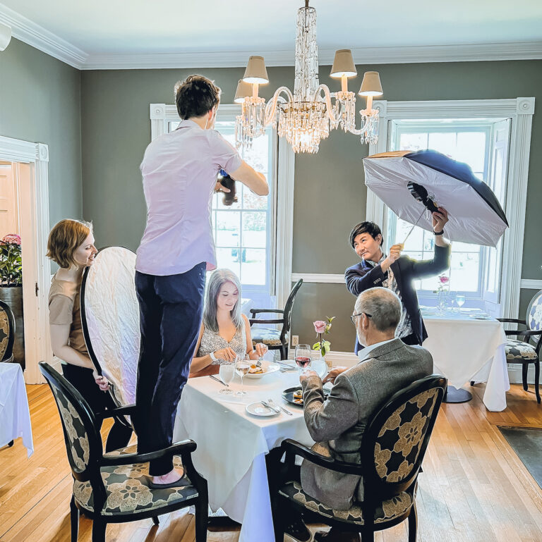 A finely detailed plan was essential to getting everything done in only a few short days. Beforehand, we performed model searches, designed mood and storyboards, and coordinated everyone’s schedules—models, hotel and restaurant staff, management, and our team. However, even with all that planning, we had to account for the unpredictable: changing weather. When the light was right, our team had to move quickly, which sometimes meant rearranging the schedule or getting creative. Having both a solid plan and a go-with-the-flow attitude allowed us to meet all our goals and get some fabulous shots.