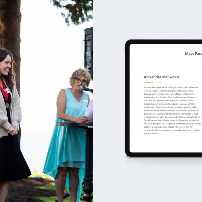 Last but certainly not least, we wanted to shine a spotlight on the talented Cmolik Scholars as well as the mentors, volunteers, and staff members who make it all possible. The Cmolik Foundation is ultimately about people, and the new site honours this commitment to relationships by prominently featuring the stories of students and mentors in bios and testimonials.