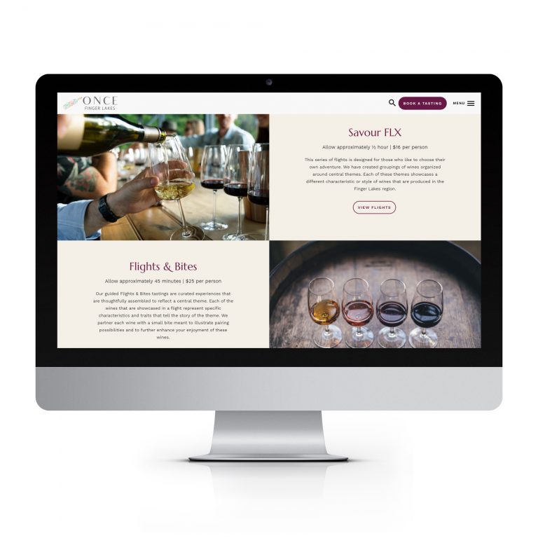Wine culture may have a reputation for pretension, but Once Finger Lakes is changing that narrative. The tasting room invites everyone to enjoy wine, from connoisseurs to more casual wine drinkers, fostering an environment of openness, curiosity, and enthusiasm. The experience may be luxurious, but it’s also fun and fresh. We communicated this more relaxed and accessible sensibility with bright photography, friendly, conversational copy, and a modern, approachable colour palette.