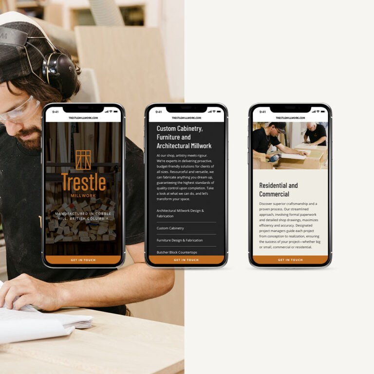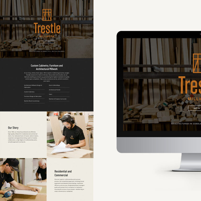 When a long-standing mill shop needed a brand refresh, we were happy to deliver. Trestle Millwork, operating out of Cobble Hill, BC, is known for custom, high-quality millwork. Their commitment to their product, services, and culture was as strong as ever, but they were looking for a new direction that would facilitate growth. Working closely with their team, we conceived of a bold new name and created an equally strong logo and website to match.