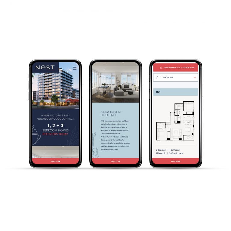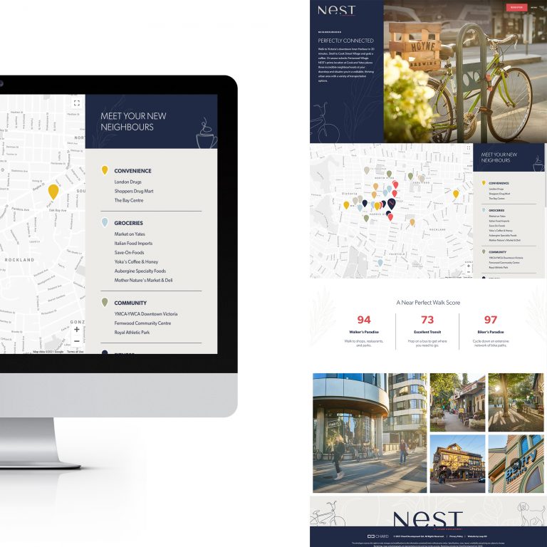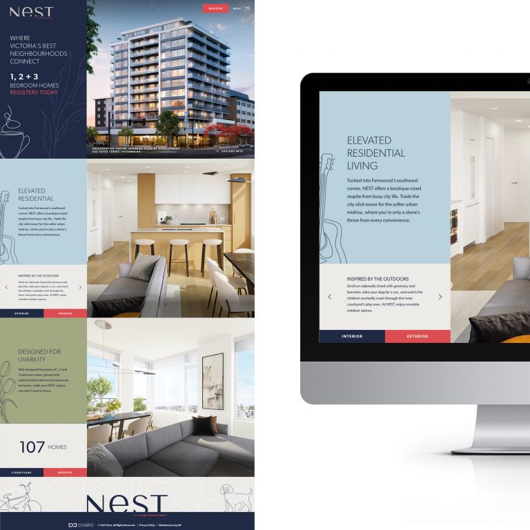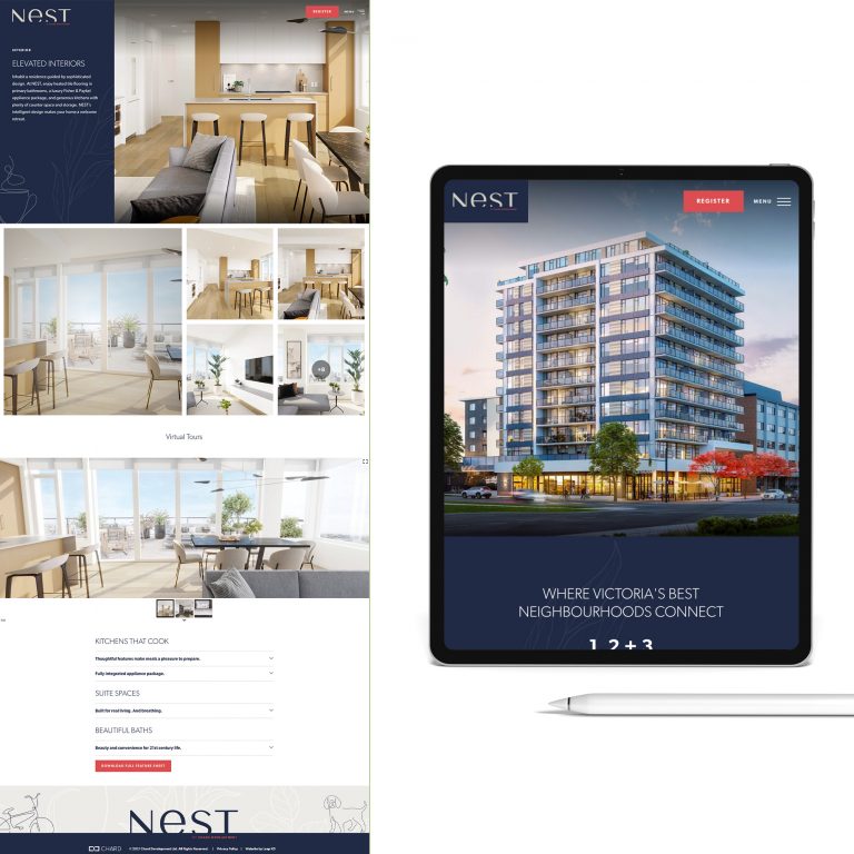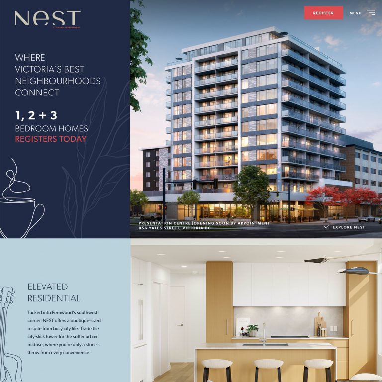 We’re lucky to call Chard Development our longtime collaborators as their real estate projects continuously enrich communities throughout Greater Victoria and Metro Vancouver. NEST, a 12-storey condominium coming to the corner of Cook and Yates in Victoria, is no exception. To announce this exciting new building’s development and attract prospective buyers, we provided NEST with an informative, attractive, and user-friendly web presence.