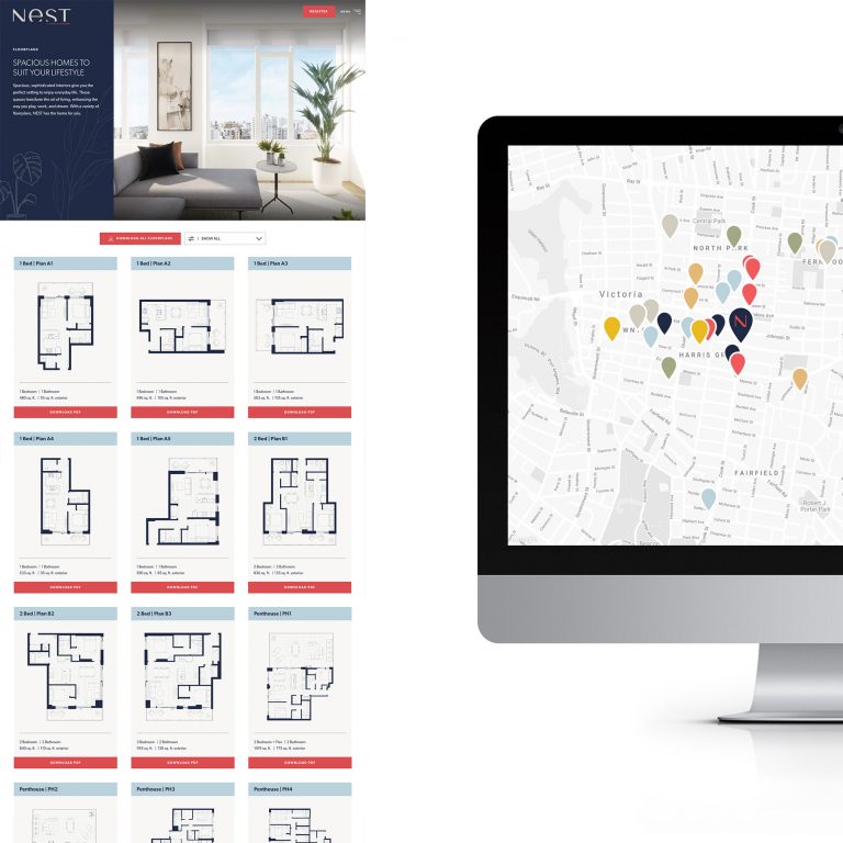 Above all, people looking for their dream home turn to real estate project websites seeking information. They want to know about the neighbourhood: the nearby shops and services, schools and parks, and transportation options. They want to understand the residences—their layout, size, amenities, and design features—as well as what the building has to offer. And they want to feel confident about the project, knowing that it’s led by a team they can trust. The NEST website meets the modern buyer’s needs, guiding them through the residences, building, and neighbourhood and providing them with what they want to know. From the beautifully designed features sheet and floorplans, to the neighbourhood amenities map, to stunning photography, to copy that draws out NEST’s many benefits, the NEST site is a joy to navigate and explore.