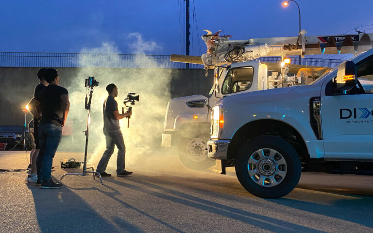 Some of the shoot highlights included directing a number of big trucks in choreographed movement, playing around with lighting to create scenes with interesting dimension, using a specialty camera lens to get up-close macro shots of fibre optic cables, and bringing in a smoke machine to heighten the drama (our ever-helpful project coordinator, Geneva, jumped in to assist).